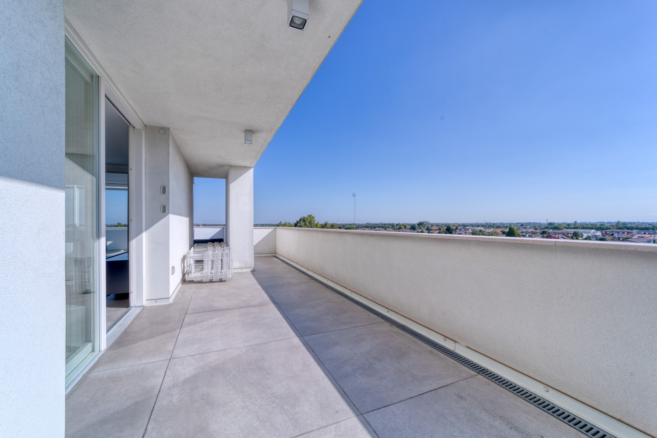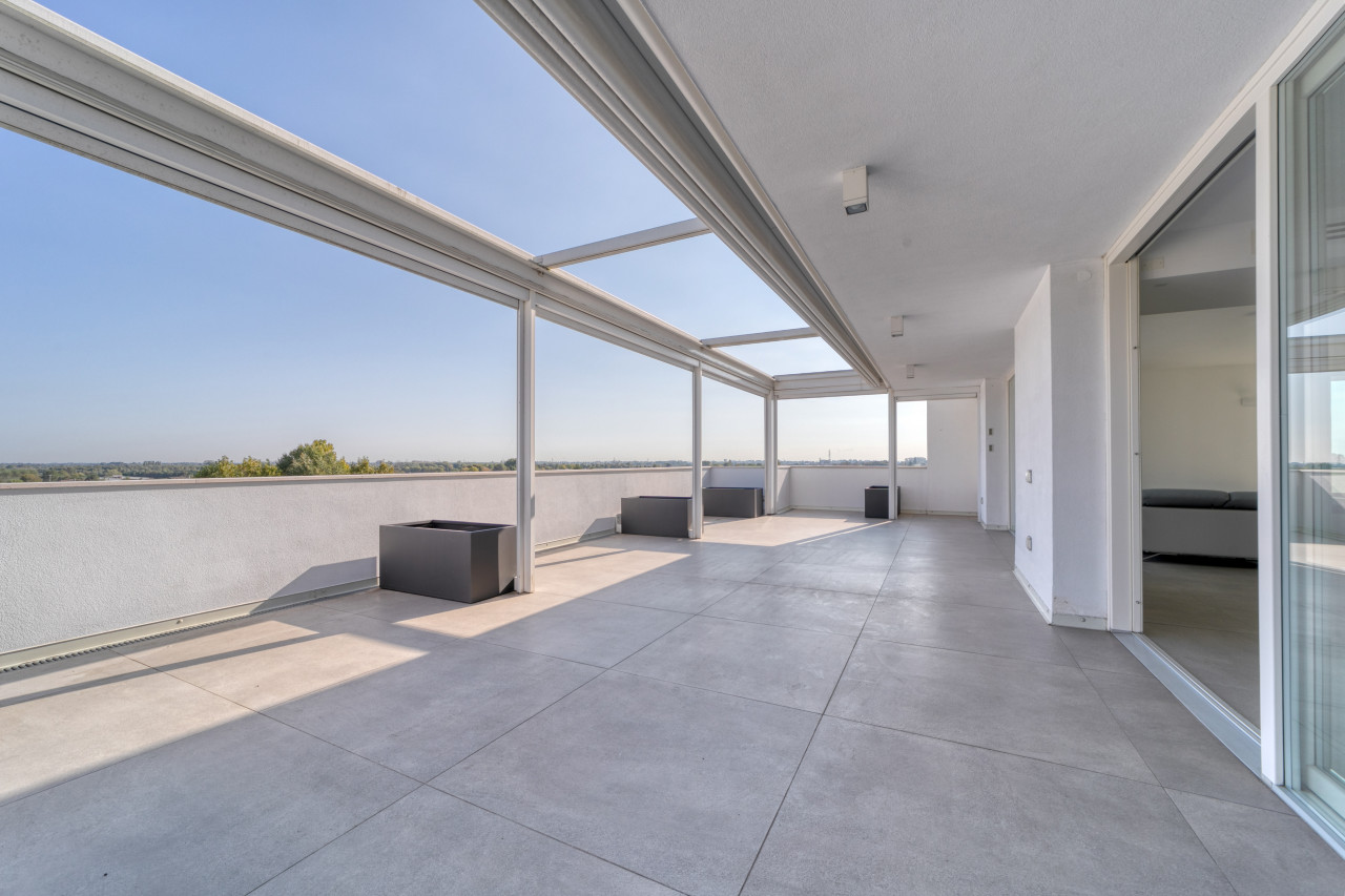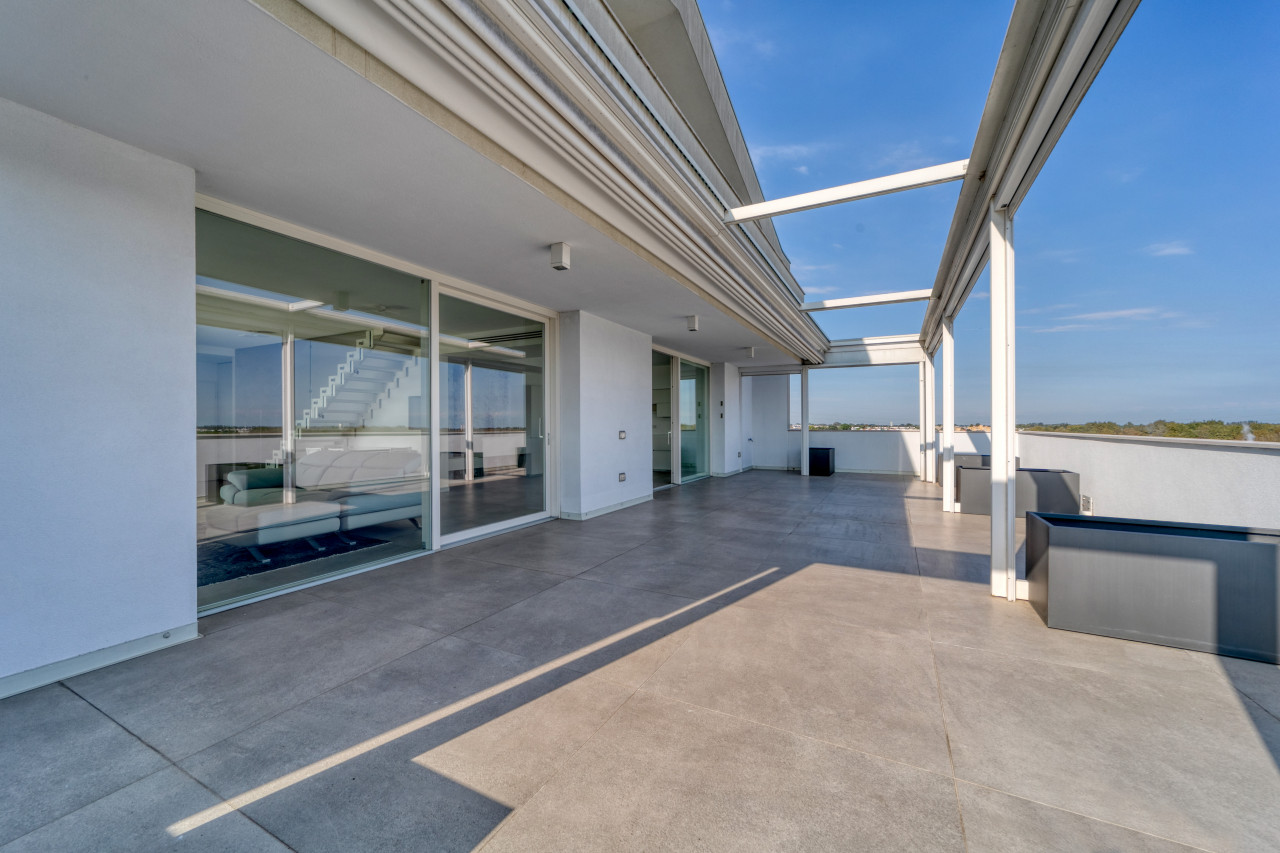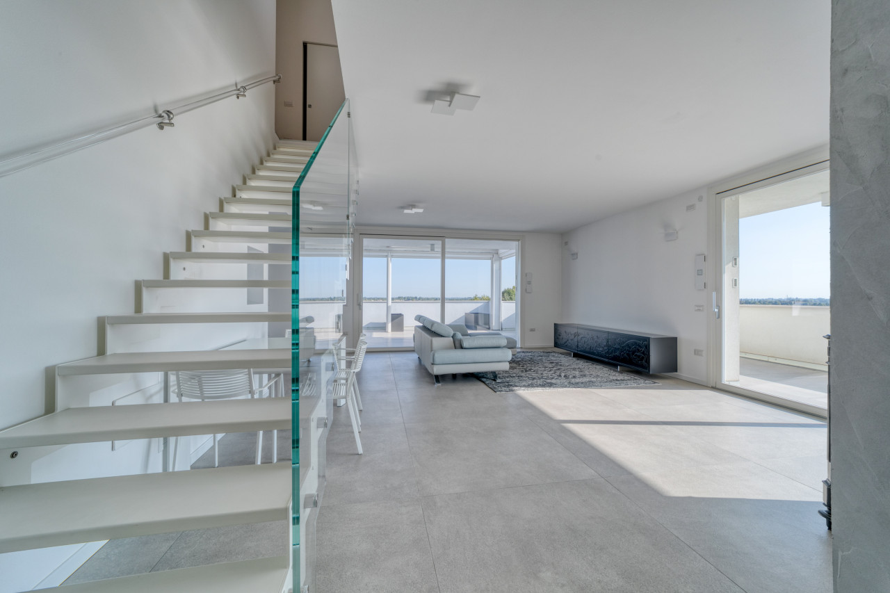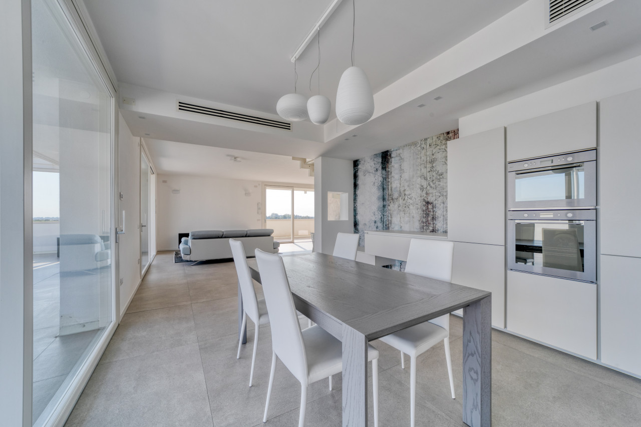 Offre una splendida zona giorno open space valorizzata dalle ampie vetrate, con accesso alla splendida terrazza panoramica di Mq 100 sviluppata su 2 lati, anti e bagno a giorno. La zona notte mansardata con travi in legno a vista sbiancate, propone 3 spaziose camere da letto, 2 bagni finestrati con doccia e locale ad uso cabina armadi - ripostiglio. A completare l'abitazione, un ampio garage doppio in lunghezza con basculante motorizzato e cantina. L’appartamento non è mai stato abitato e viene venduto con arredo compreso nel prezzo.